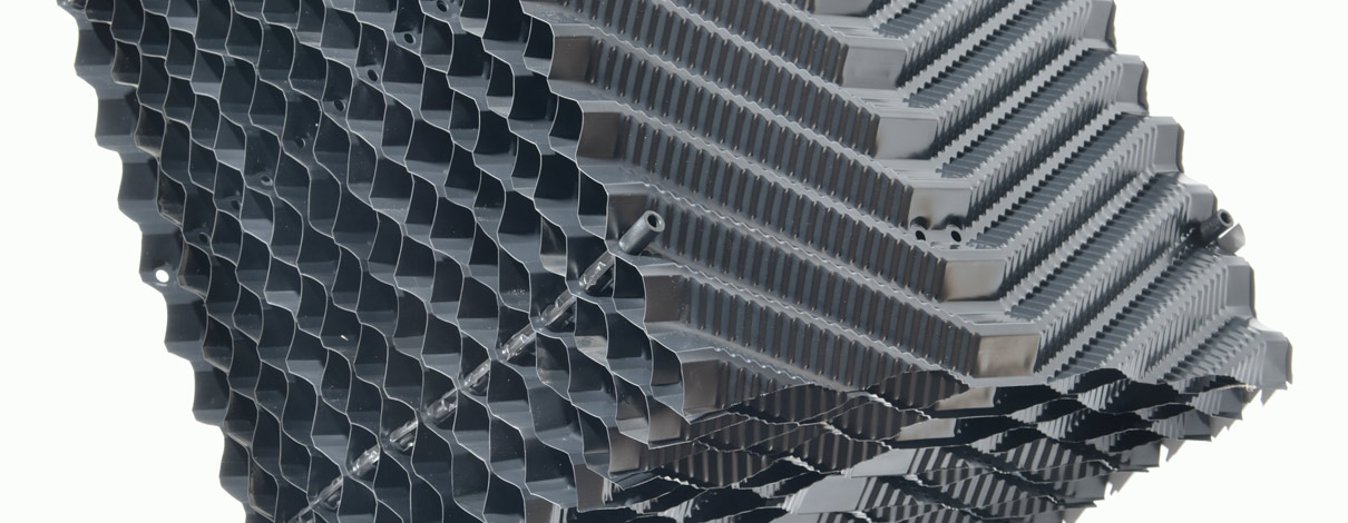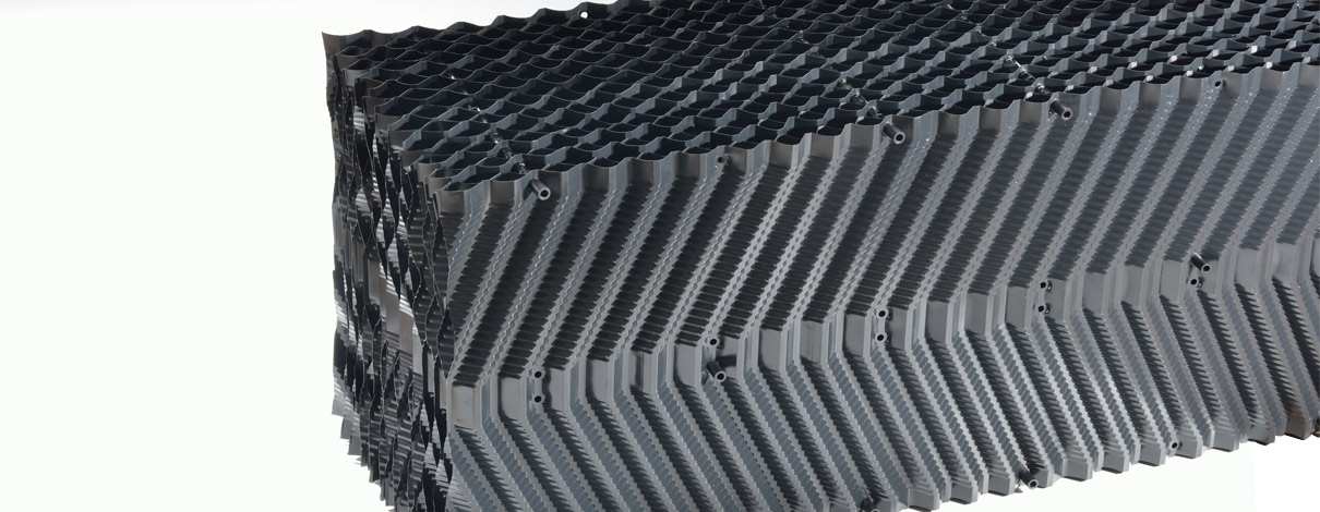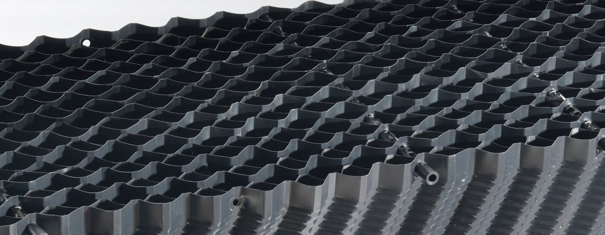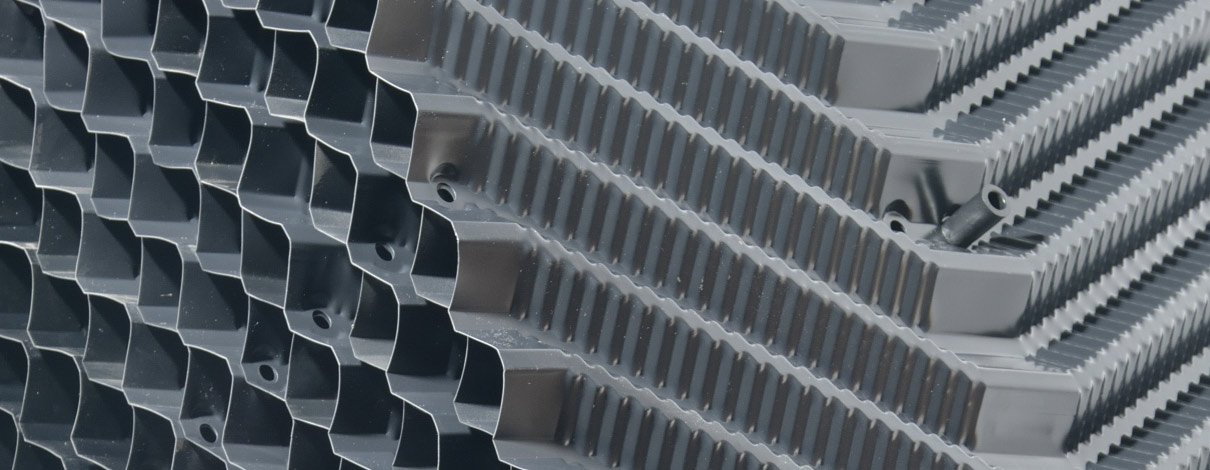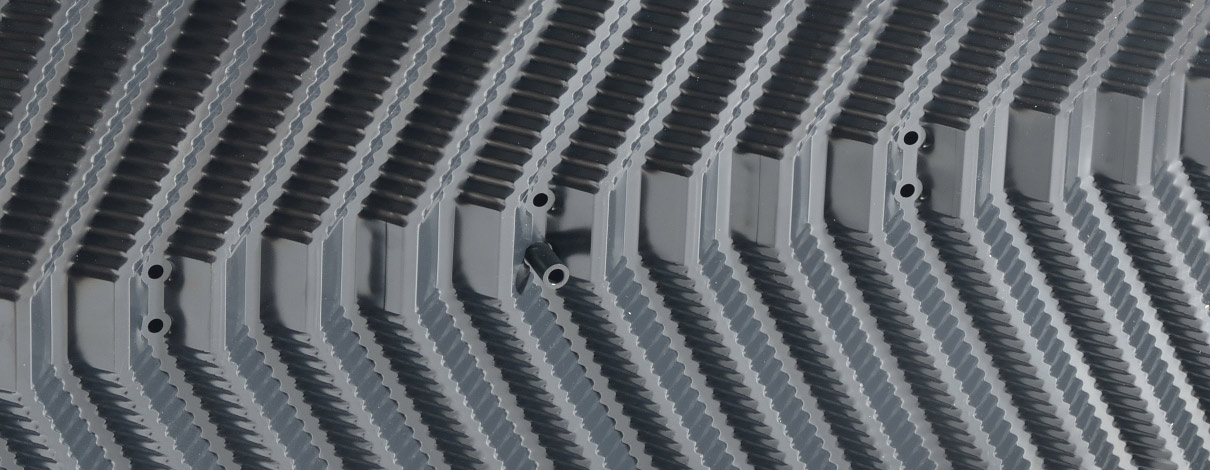 - Tvar a členění kanálků maximalizuje styčnou plochu vody s chladící výplní s vysokým výkonem chlazení.
